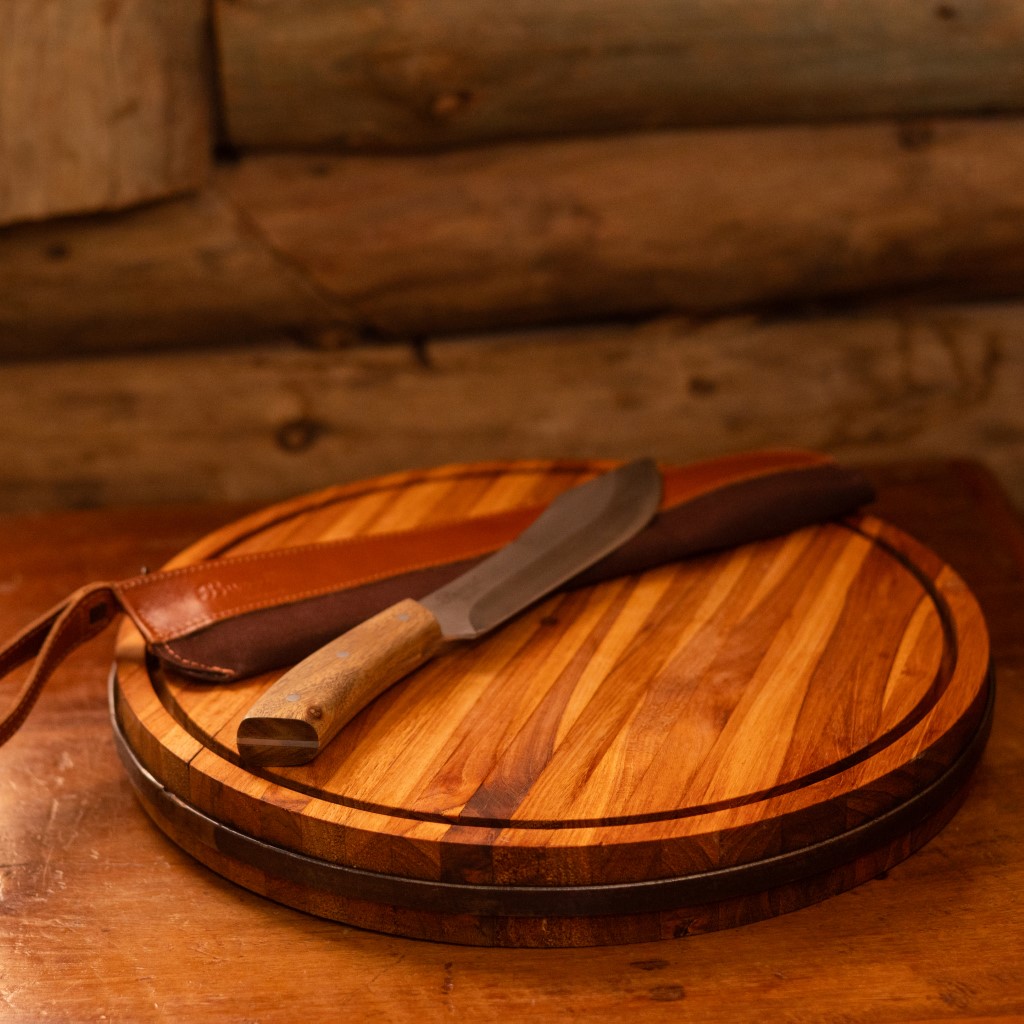 É uma faca de churrasco com uma lâmina curva, o que a torna ideal para cortar carnes de maneira eficiente e elegante. O design estilizado não apenas proporciona um bom efeito visual, mas também ajuda a realizar cortes precisos, tanto na tábua de carne quanto diretamente no espeto. É uma ferramenta muito apreciada por churrasqueiros, pois permite fatiar carnes de maneira rápida e com menos esforço.