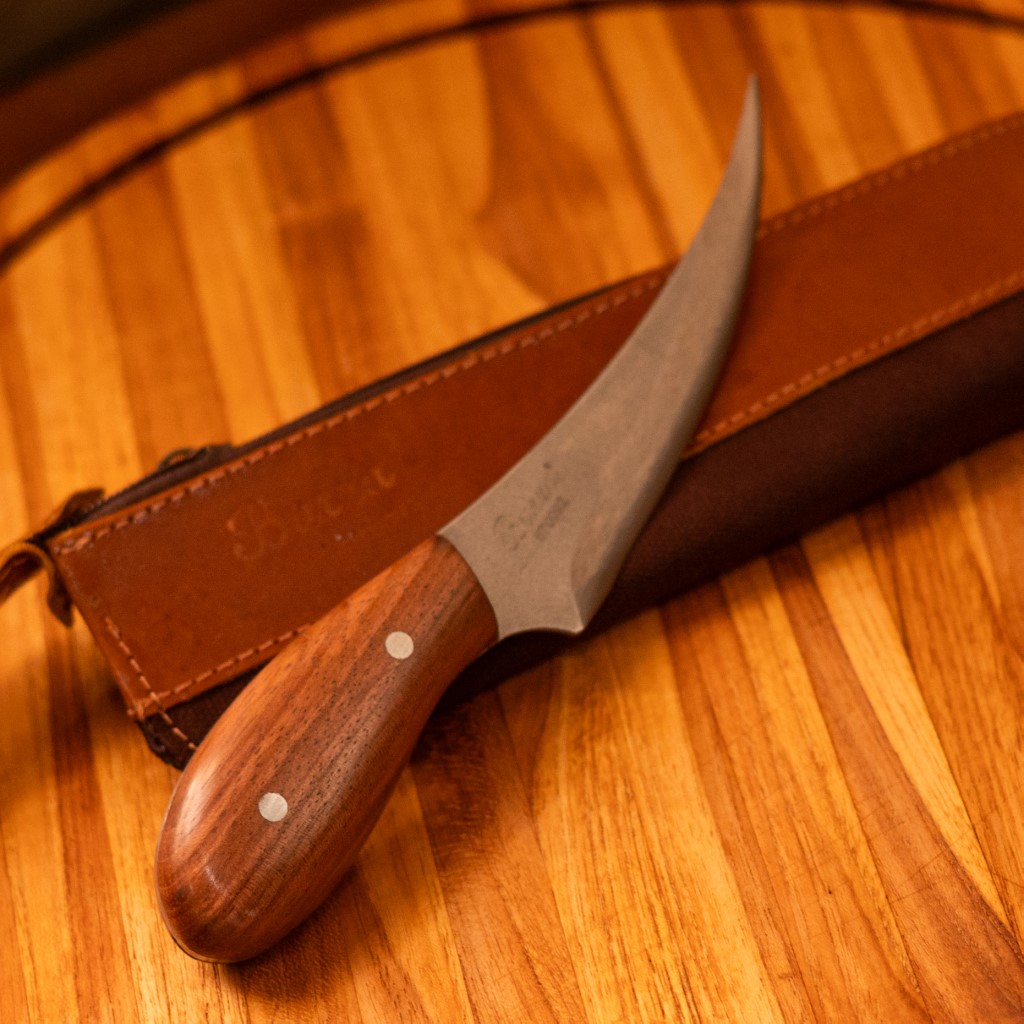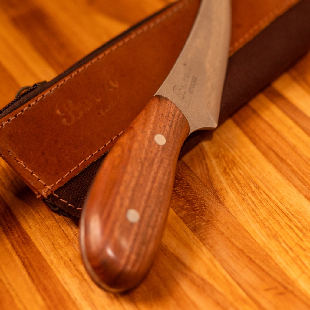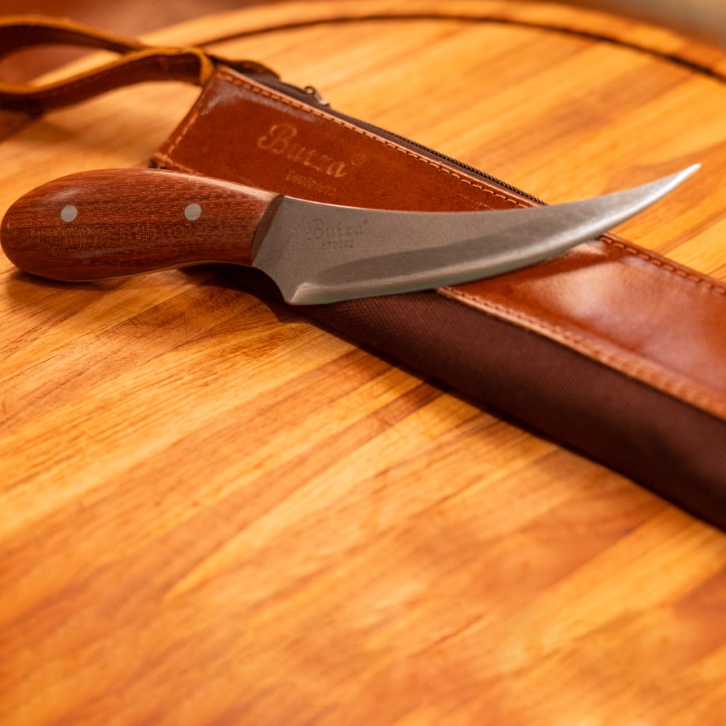 Para aumentar a praticidade, a faca é acompanhada por um estojo individual em couro e lona, facilitando o transporte e a proteção do utensílio. Com um design que combina rusticidade e eficiência, essa faca não só complementa sua coleção de ferramentas na cozinha, mas também é perfeita para quem aprecia a arte de cozinhar com precisão e cuidado. Uma excelente adição para amantes de churrasco e gastronomia em geral!