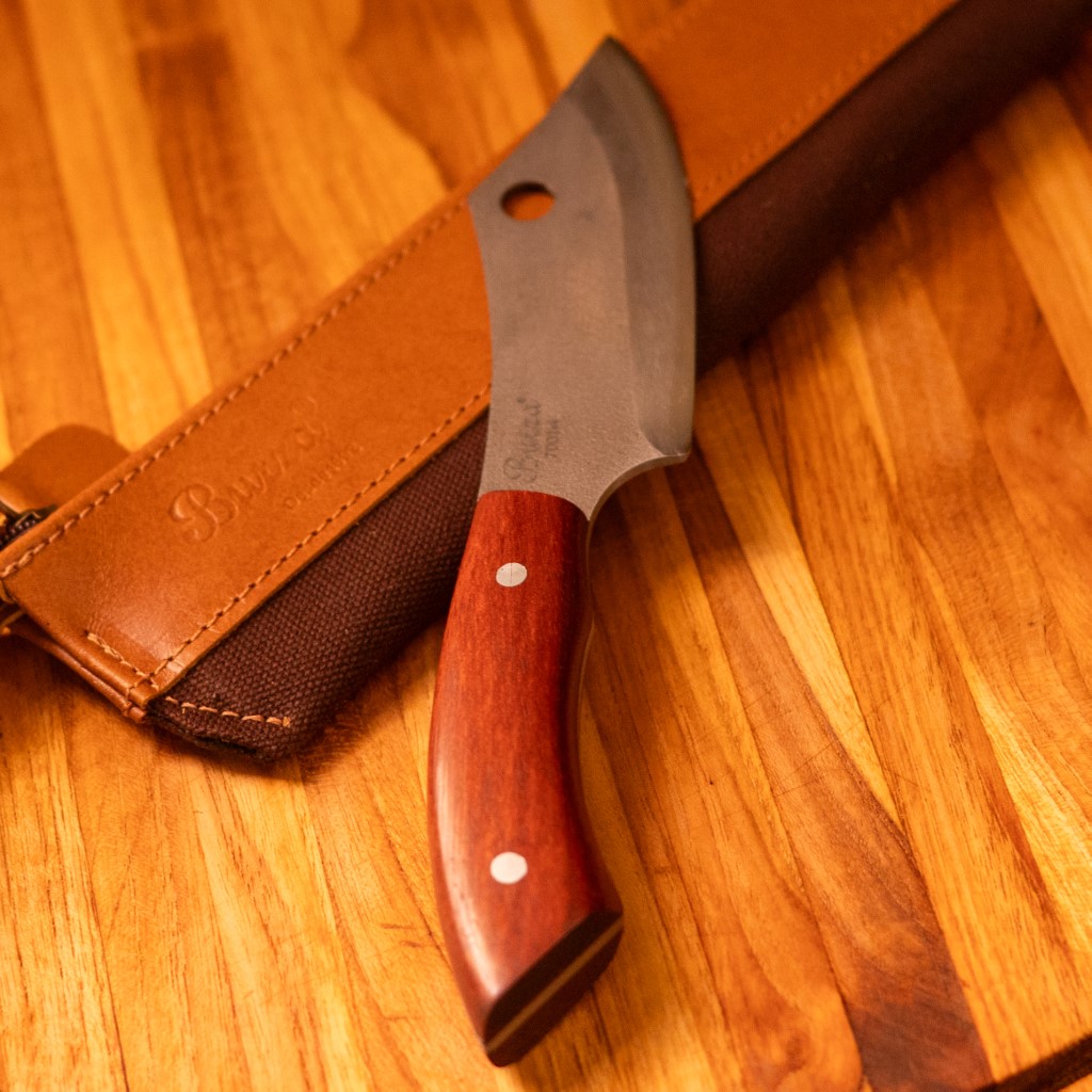 O estojo individual em couro e lona a torna ainda mais versátil, permitindo que você a transporte com elegância e segurança para qualquer ocasião. Combinando design estético e funcionalidade, essa faca é uma escolha perfeita para quem ama explorar diferentes combinações gastronômicas!